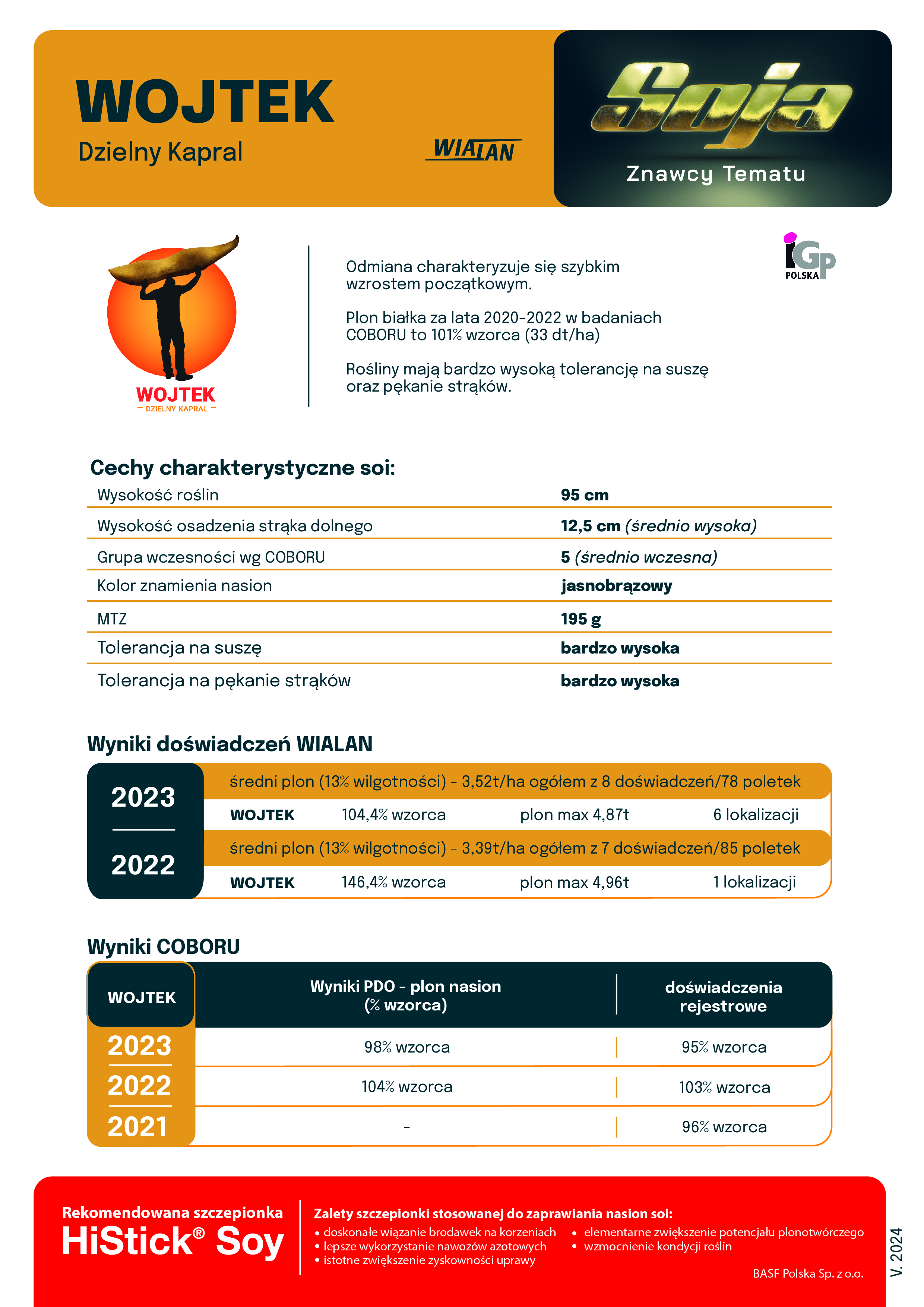 Bardzo wysoka zawartość białka ogólnego (38,1 % s.m). Odmiana o równomiernym dojrzewaniu 8 w skali do 9.